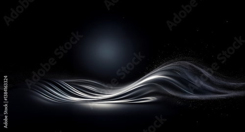 The watermark will not be included on Wall mural.: Dark abstract backdrop with luminous waves flowing across the bottom and a soft, distant glow -