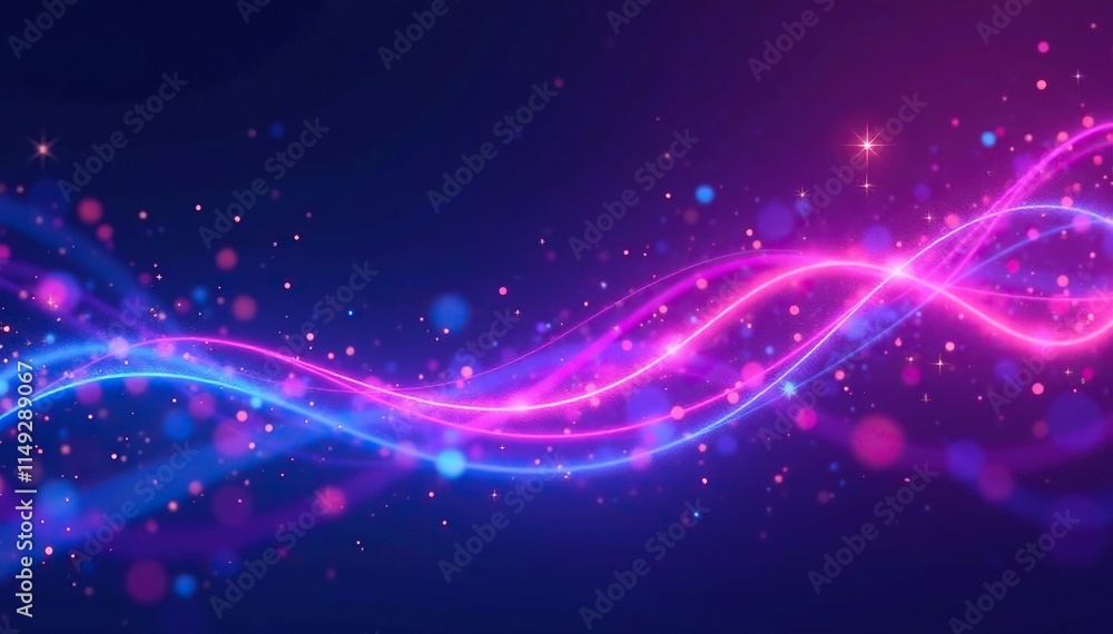 The watermark will not be included on Wall mural.: Dark abstract background with swirling purple and blue neon layers and twinkling lights, glowy atmos