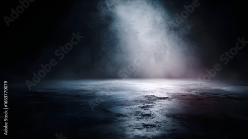 Wall mural dark atmospheric empty space with a dramatic spotlight illuminating a hazy textured ground creating
