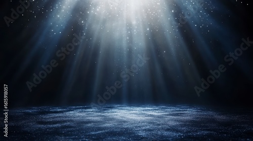 The watermark will not be included on Wall mural.: Dark blue background with bright light rays and sparkles -