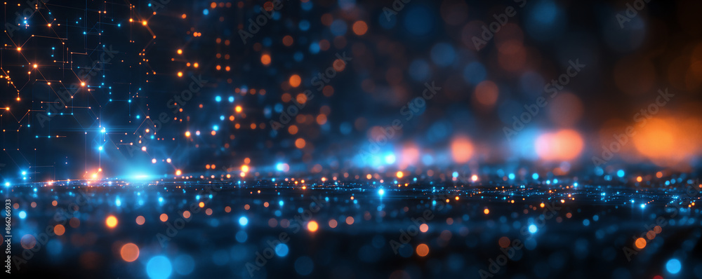 Wall mural : Dark blue background with digital waves and glowing dots representing the concept of blockchain tech