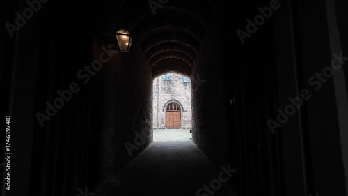 The watermark will not be included on Wall mural.: Dark castle archway creating a path to an ancient building and bright courtyard - pov