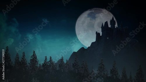 Wall mural dark castle on a moonlite night 4k loop features a haunted castle with a full moon and moving clouds