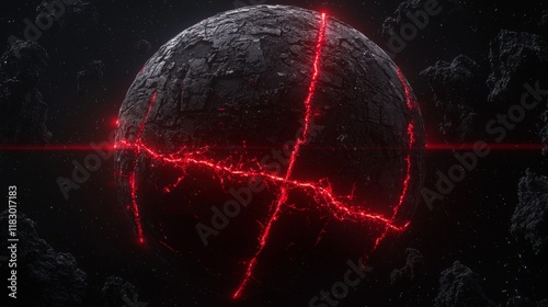 The watermark will not be included on Wall mural.: Dark cosmic planet with cracks and glowing red lines in outer space background