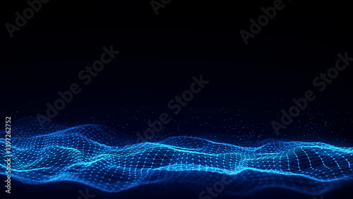 Wall mural dark cyberspace in digital background. abstract technology wave with motion glowing dots and lines.