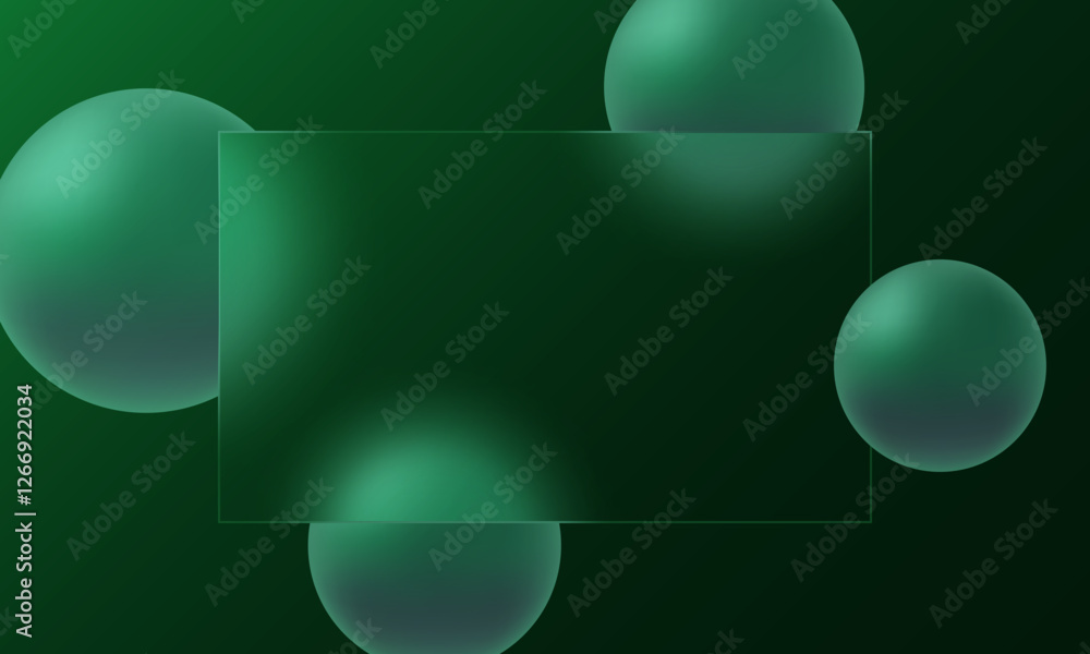 The watermark will not be included on Wall mural.: Dark emerald background and spheres with a rectangular plate of transparent material in the center,