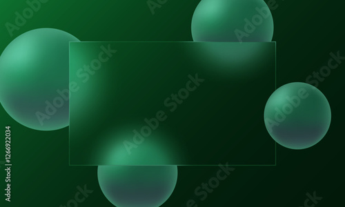 Wall mural dark emerald background and spheres with a rectangular plate of transparent material in the center,