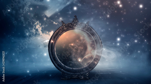 Wall mural dark forest, magic mirror. night view, smoke, smog, neon light, moon. dark fantasy mystical landscap