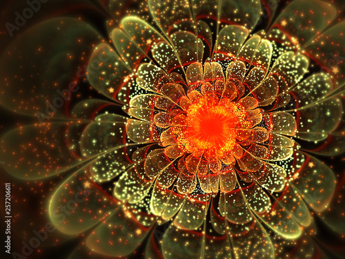 The watermark will not be included on Wall mural.: Dark fractal flower with stars and sparkles, digital artwork for creative graphic design
