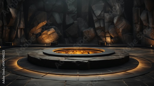 The watermark will not be included on Wall mural.: Dark geometric rock shapes with spotlights, creating a dramatic setting for product displays with a