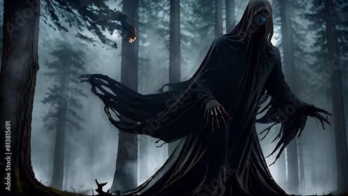 The watermark will not be included on Wall mural.: Dark ghost creature in haunted forest 4k loop features an a - i - generated video of a dark creature wi