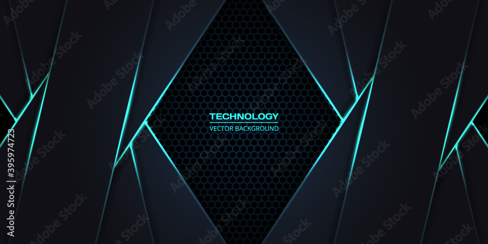 The watermark will not be included on Wall mural.: Dark gray and turquoise hexagonal carbon fiber background with green luminous lines and highlights -