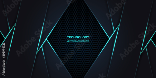 Wall mural : Dark gray and turquoise hexagonal carbon fiber background with green luminous lines and highlights -