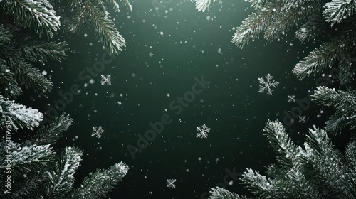The watermark will not be included on Wall mural.: Dark green christmas background with fir trees, snowflakes and empty space - copy space for your text