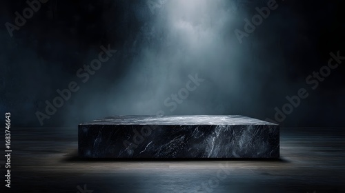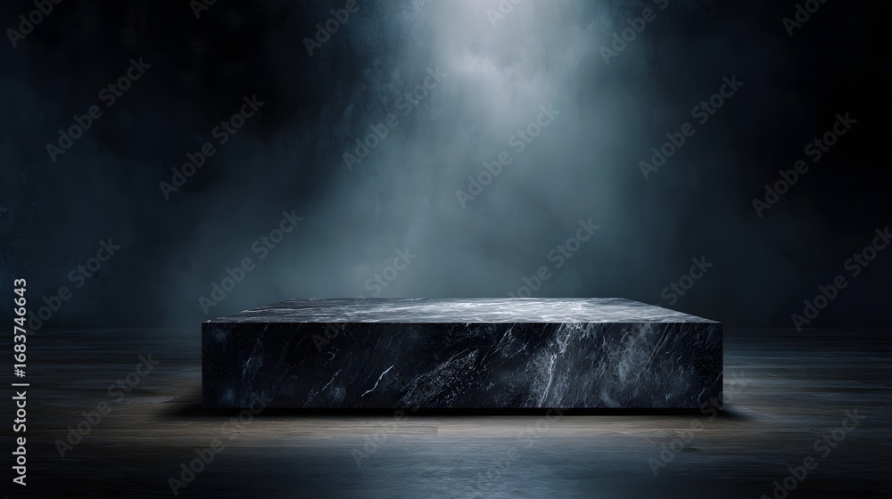 Wall mural dark marble rectangular platform illuminated by a soft glow in a mysterious smoky atmospheric backgr