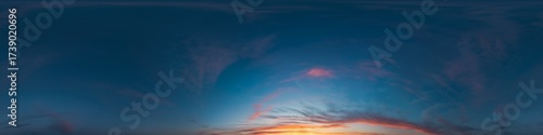 Wall mural dark moody twilight sunset sky 360 panorama with bright glowing red pink cirrus clouds. hdr 360 seam