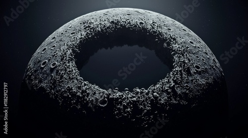 The watermark will not be included on Wall mural.: Dark space scene featuring a circular hollow moon with textured surface and space background