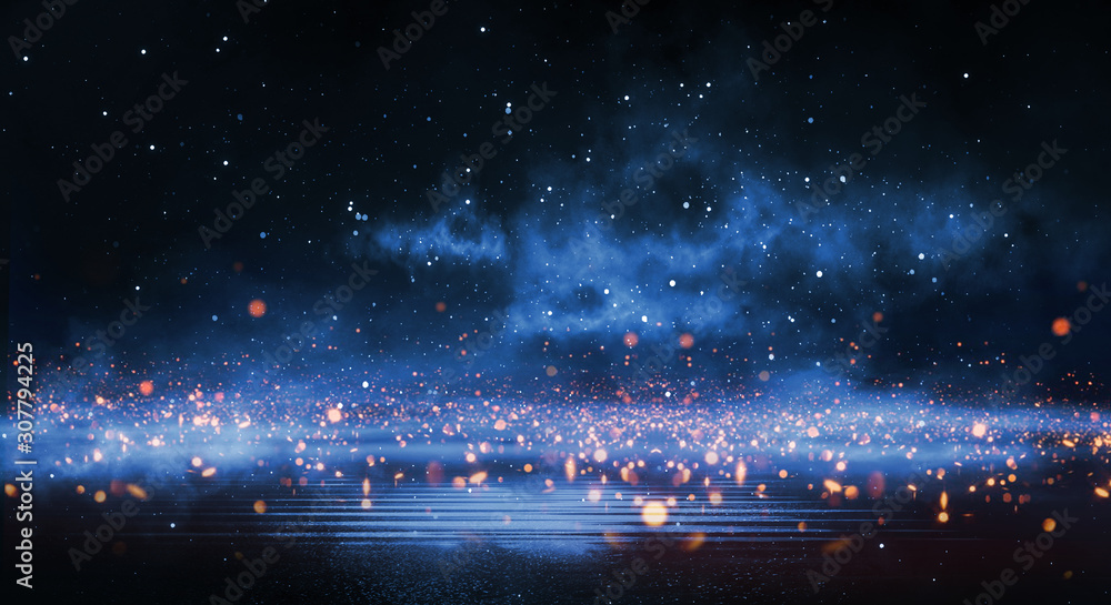 The watermark will not be included on Wall mural.: Dark street wet asphalt, reflection of new rays on a wet surface - abstract bokeh light - night street