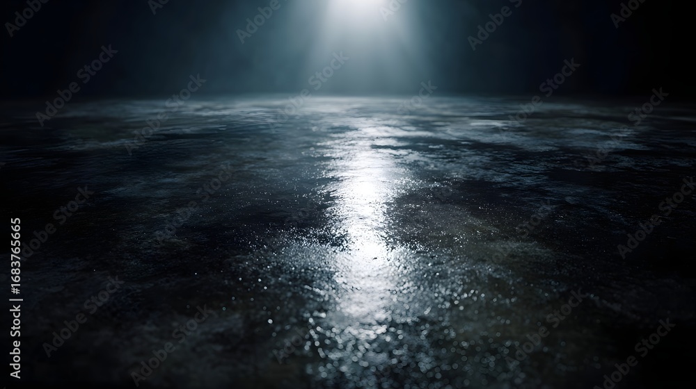 The watermark will not be included on Wall mural.: Dark wet and highly reflective floor illuminated by a powerful spotlight creating a dramatic and atm
