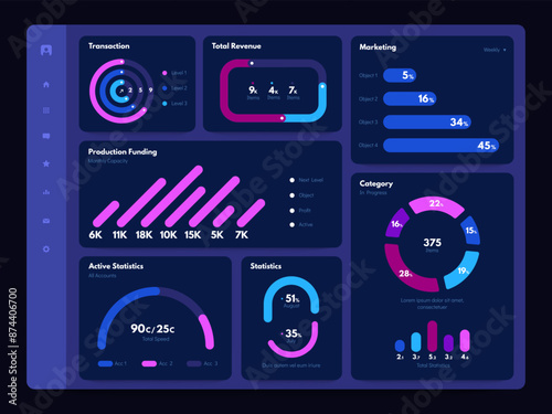 Wall mural dashboard dark theme. web site dashboard admin panel with dark graphs charts diagrams and statistics