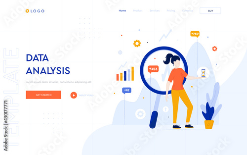 Wall mural : Data analysis concept website template - the girl analyzes the data and makes graphs and charts - digi