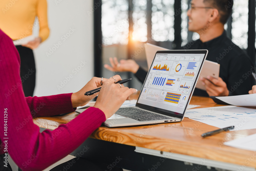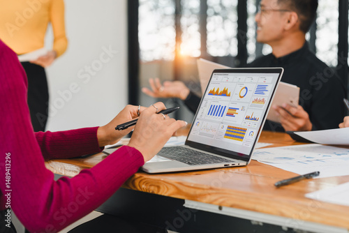 The watermark will not be included on Wall mural.: Data analysis meeting with business team using laptop and digital chart for project planning and str