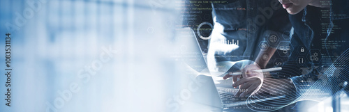Wall mural data anlytics, ai and database management technology. it specilist team working on digital tablet co