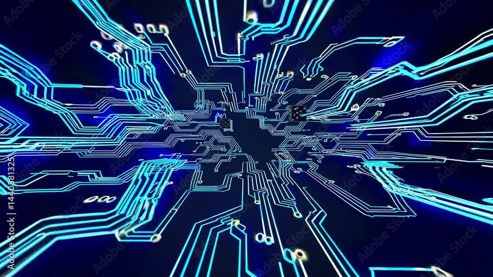 Wall mural data blocks are traveling through a futuristic circuit board network, creating a powerful visualizat - Wall murals Wall mural data blocks are traveling through a futuristic circuit board network, creating a powerful visualizat - Wall murals