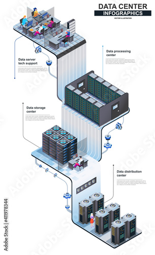 Wall mural data center modern isometric infographics. 3d isometry graphic design concept with tech support and