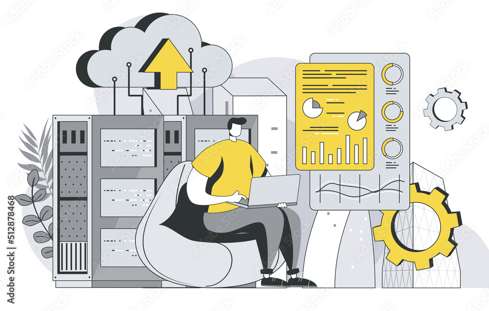 The watermark will not be included on Wall mural.: Data center technology concept with outline people scene - man engineer maintains server room and con