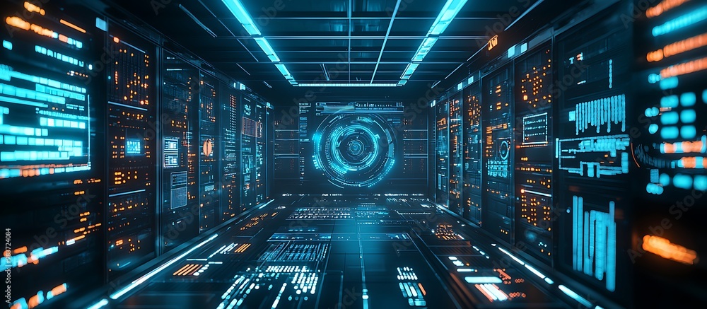 Wall mural data center with servers and network monitoring displays in ultra hd.