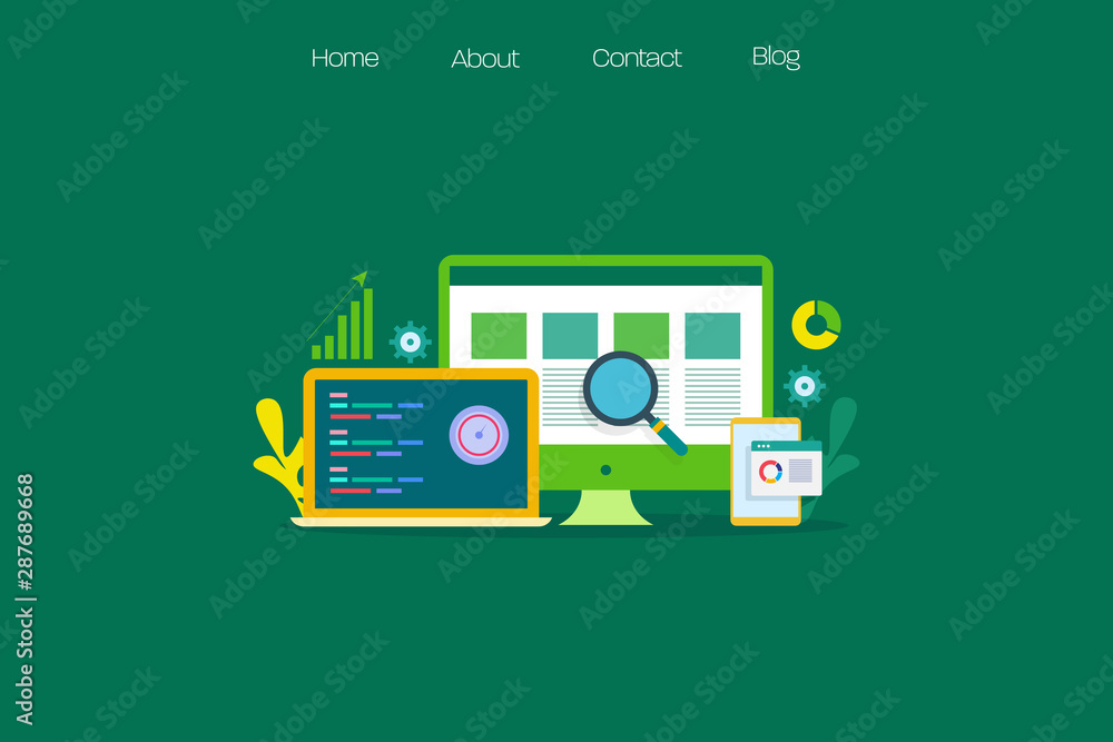 Wall mural data driven marketing, optimized website data, seo concept, flat design vector web banner.