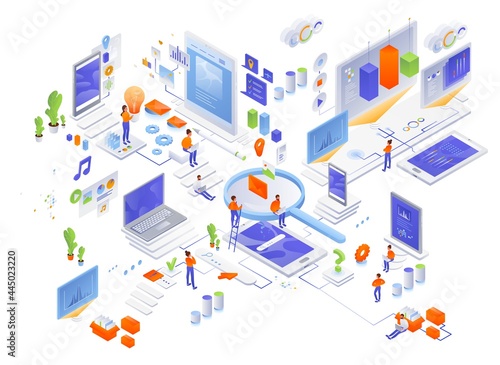 Wall mural : Data management, creating website content, searching for information, vector isometric icon set -