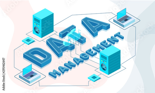 Wall mural : Data management concept based isometric design, illustration of web servers connected to laptop on a