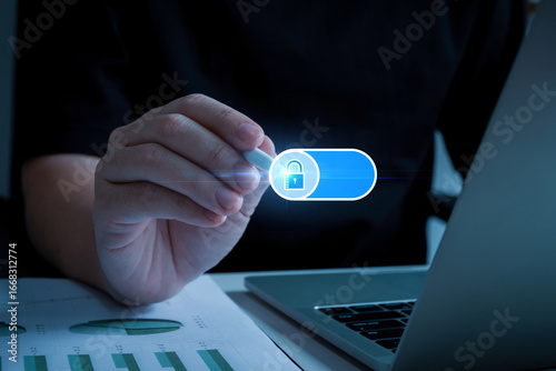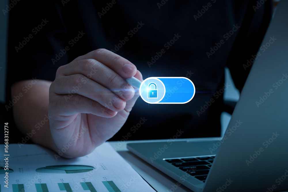 Wall mural data protection. people hand using pen touch on digital lock button on data protection application p
