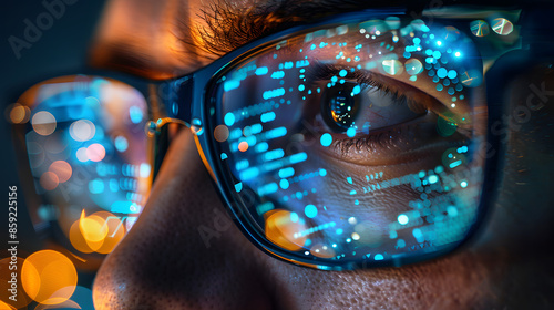 Wall mural : Data reflecting on eyeglasses on man's face - computrer programmer big data and ux designer concept