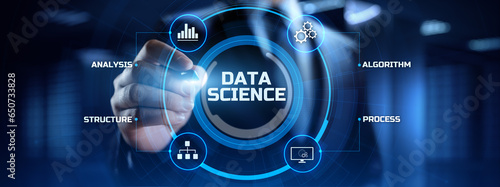 Wall mural : Data science analytics concept - businessman pressing button on screen -