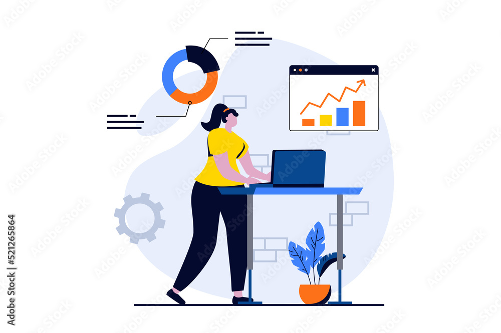 Data science concept with people scene in flat cartoon design - woman working with diagrams and chartWall mural