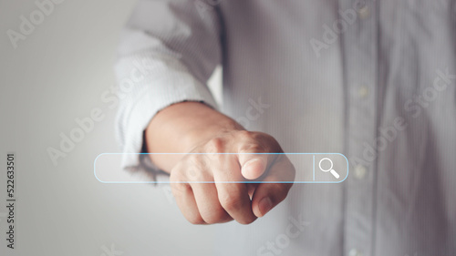 The watermark will not be included on Wall mural.: Data search technology seo search engine optimization - search button on virtual screen pressed with