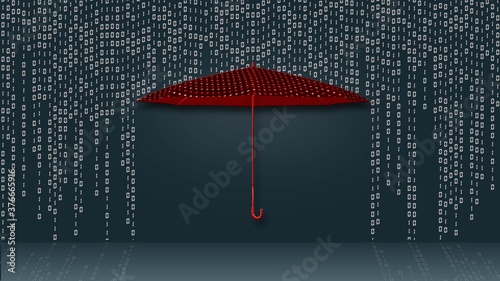 Wall mural data transfer as hanging rows of the binary code in matrix style over a protecting red umbrella - da