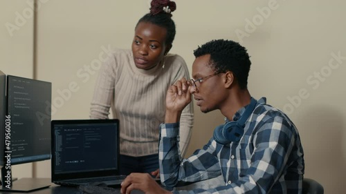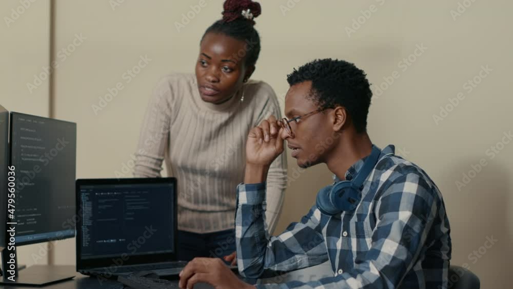 Wall mural : Database developer removing glasses while explaining algorithm to colleague coder pointing at runnin