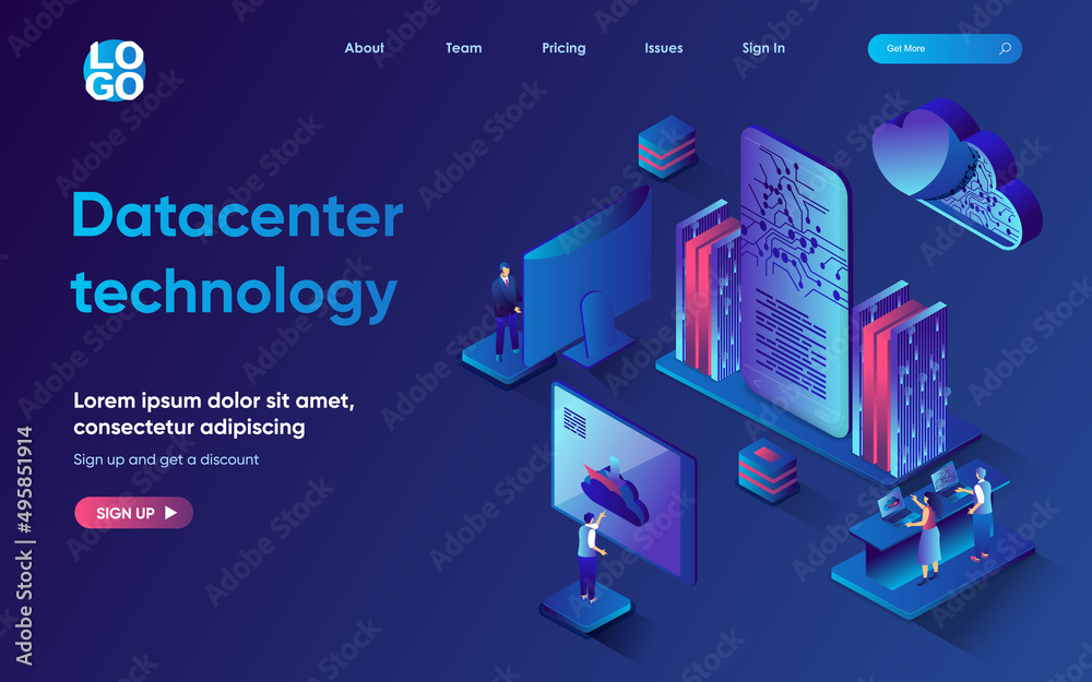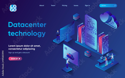 The watermark will not be included on Wall mural.: Datacenter technology concept 3d isometric web landing page - people analyze big data and work with c