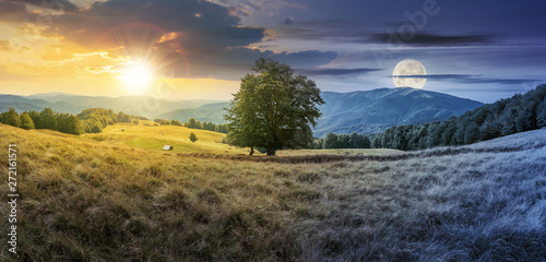 Wall mural day and night time change concept above the beech tree on the meadow in mountains. landscape with su - Wall murals Wall mural day and night time change concept above the beech tree on the meadow in mountains. landscape with su - Wall murals