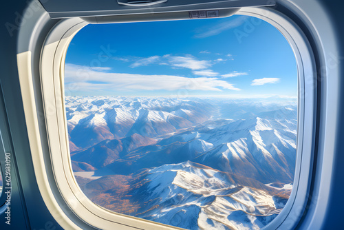 The watermark will not be included on Wall mural.: Daytime view of mountains from above from airplane window ai generated art