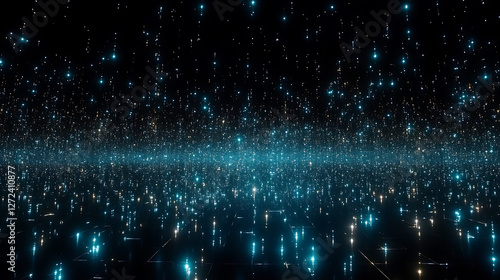 Wall mural dazzling digital dimension of dancing dots in dynamic deep dark depths with reflected light.
