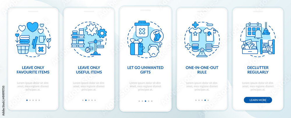 Wall mural decluttering tips oonboarding mobile app page screen with concepts. home cleaning-out and declutteri