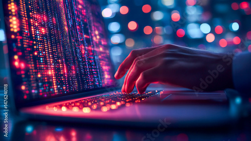 Wall mural : Dedicated programmer engaging in software development with java script code on laptop screen, embrac