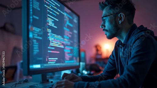 The watermark will not be included on Wall mural.: Dedicated programmer working late, writing complex code on a large display screen
