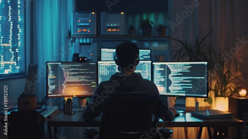 Wall mural dedicated web developer engrossed in programming on multiple monitors amidst high-tech office enviro - Wall murals Wall mural dedicated web developer engrossed in programming on multiple monitors amidst high-tech office enviro - Wall murals