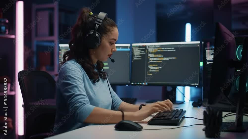 Wall mural : Dedicated woman coder at workstation immersed in programming and software development